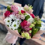 Роза – 5 шт. Эустома – 5 шт. Хризантема кустовая – 3 шт. Салал – 5 шт. Упаковка дизайнерская – 1 шт.