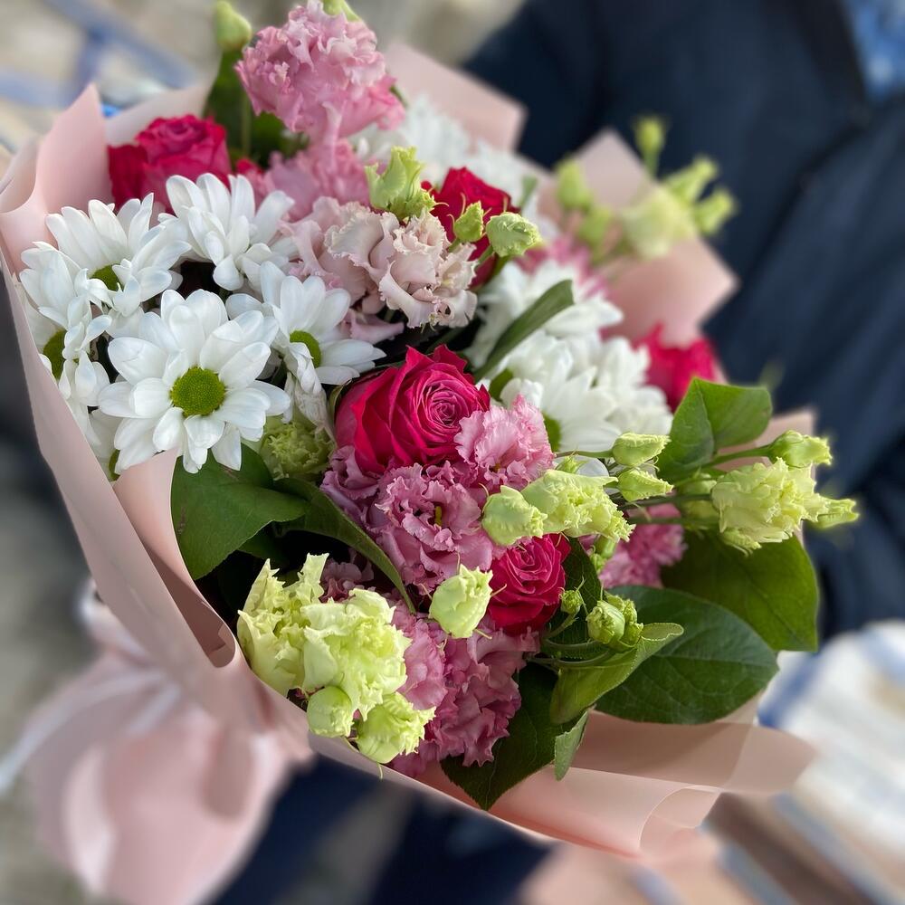 Букет из роз, хризантемы и махровой эустомы