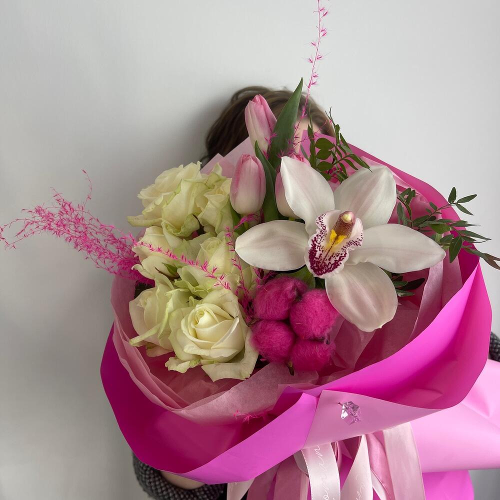 Роза – 6 шт.Тюльпан – 3 шт.Хлопок натуральный – 1 шт.Орхидея Цимбидиум – 1 шт.Тишью – 4 шт.Пленка матовая – 4 шт.Лента атласная – 4 шт.мискантус розовый – 1 шт.