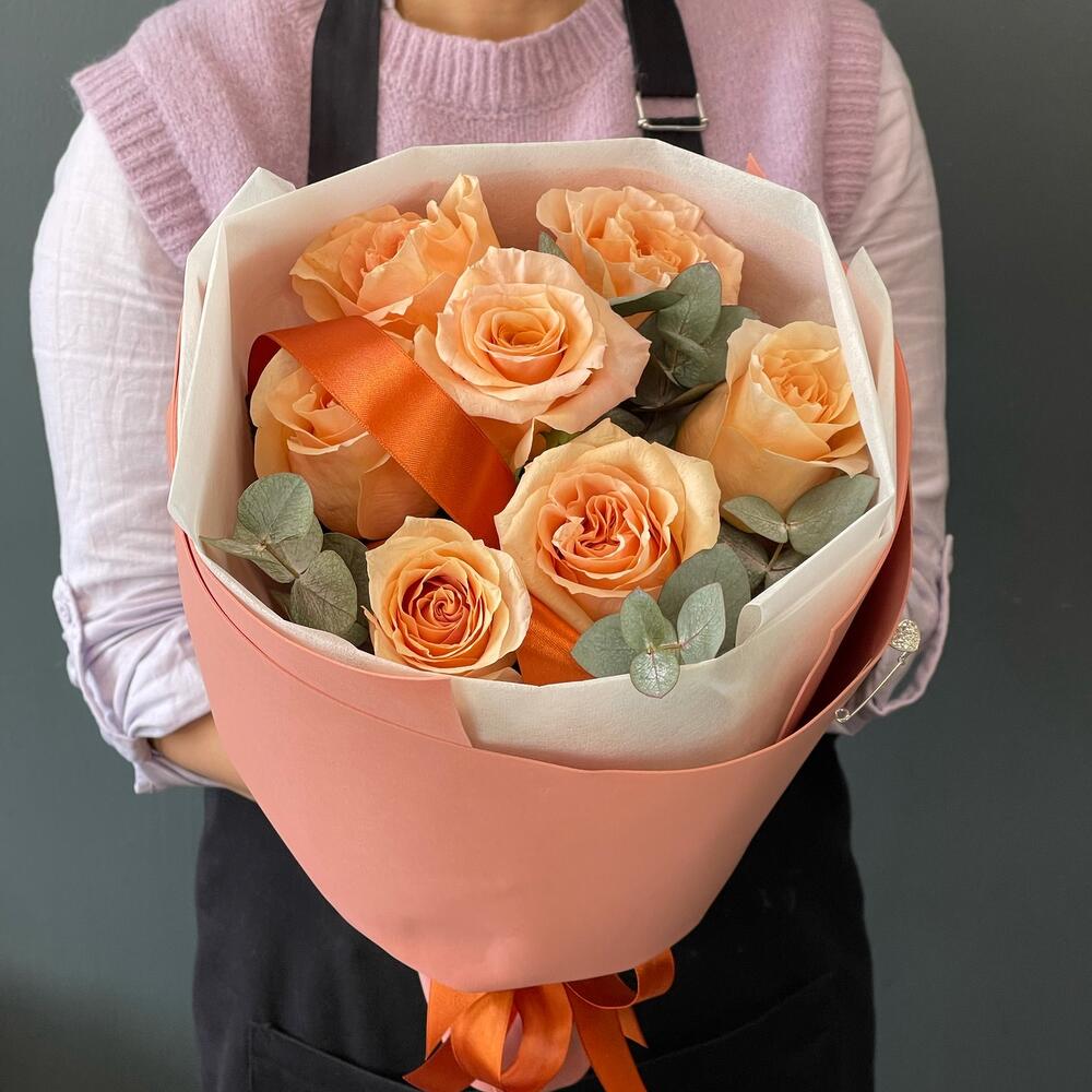Лента – 1 шт.Эвкалипт – 2 шт.Роза одноголовая – 7 шт.Упаковка дизайнерская – 2 шт.игла декоративная – 1 шт.