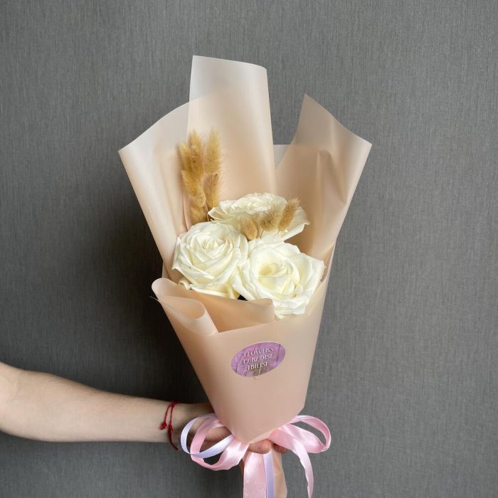 Этот букет имеет компактный размер и состоит из трех красивых роз. Цвет роз может варьироваться в зависимости от наличия и предпочтений клиента.