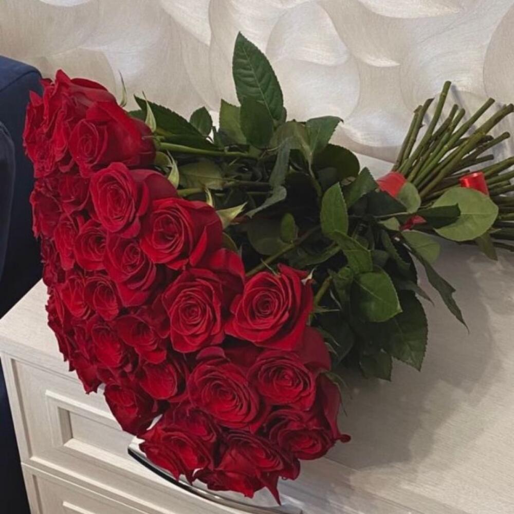 красные розы – 31 шт. Атласная лента – 1 шт.