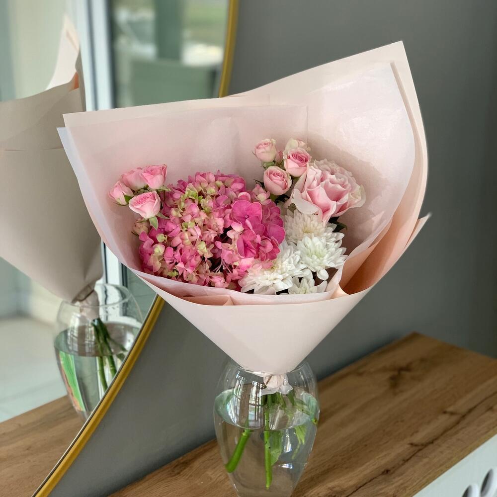 Альстромерии, Гортензии, Кустовые розы, Лизиантусы, Розы, Хризантемы
