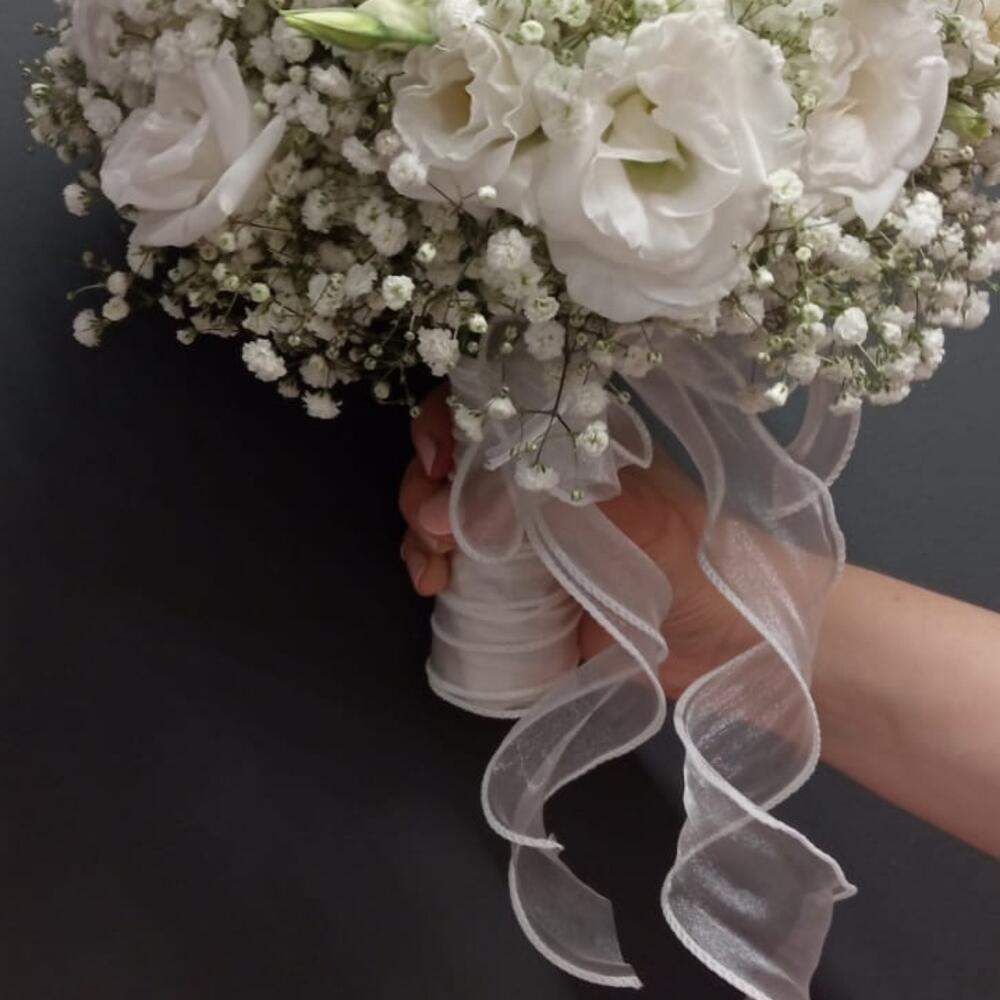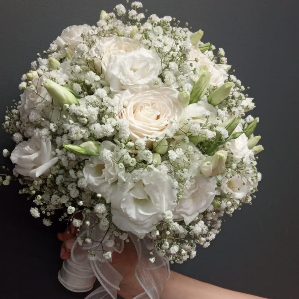 Роза белая – 9 шт.гипсофила белая – 7 шт.Лизиантус Алиса белый – 7 шт.Лента органза с бантом – 1 шт.