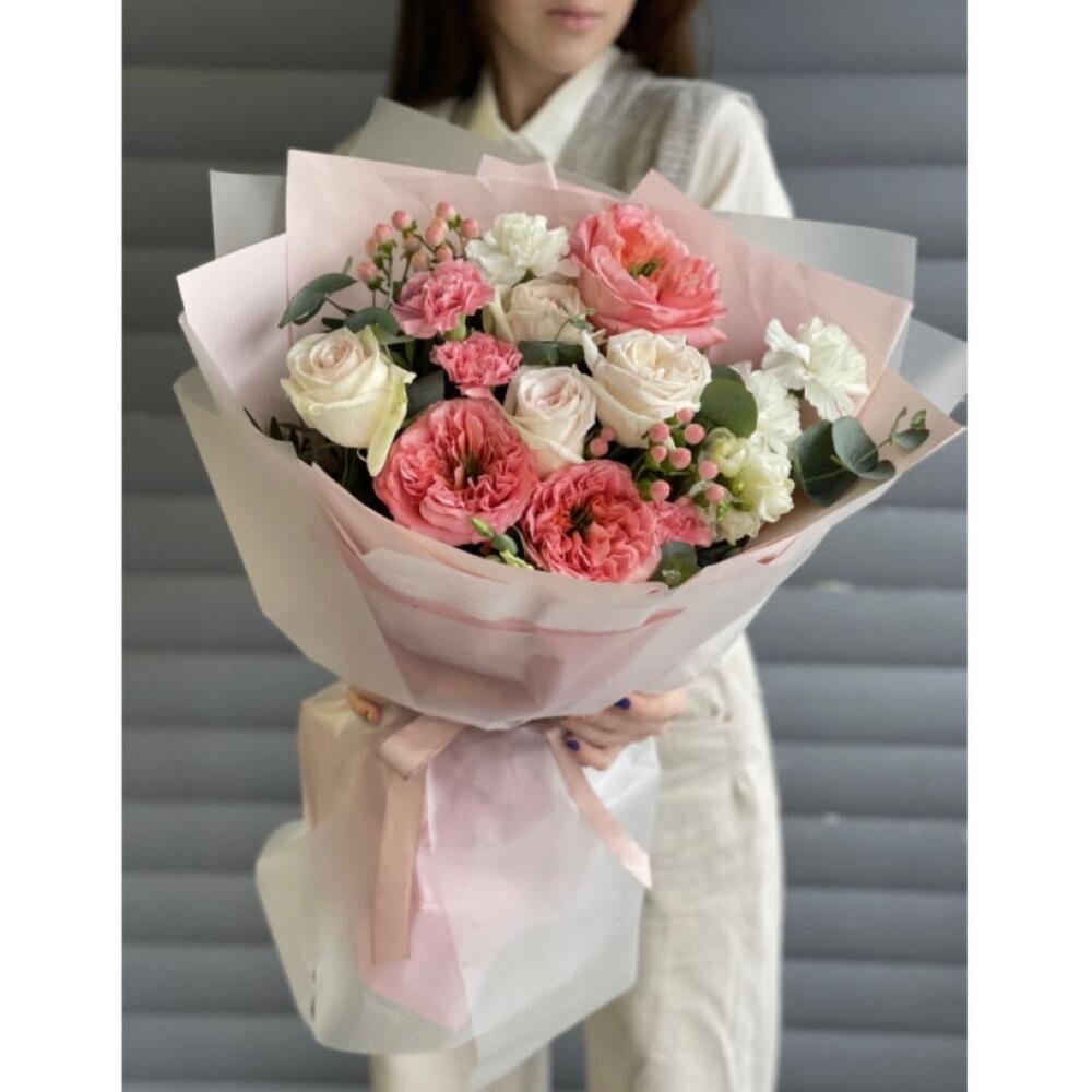 Альстромерии, Гвоздики, Кустовые розы, Лизиантусы, Розы, Хризантемы