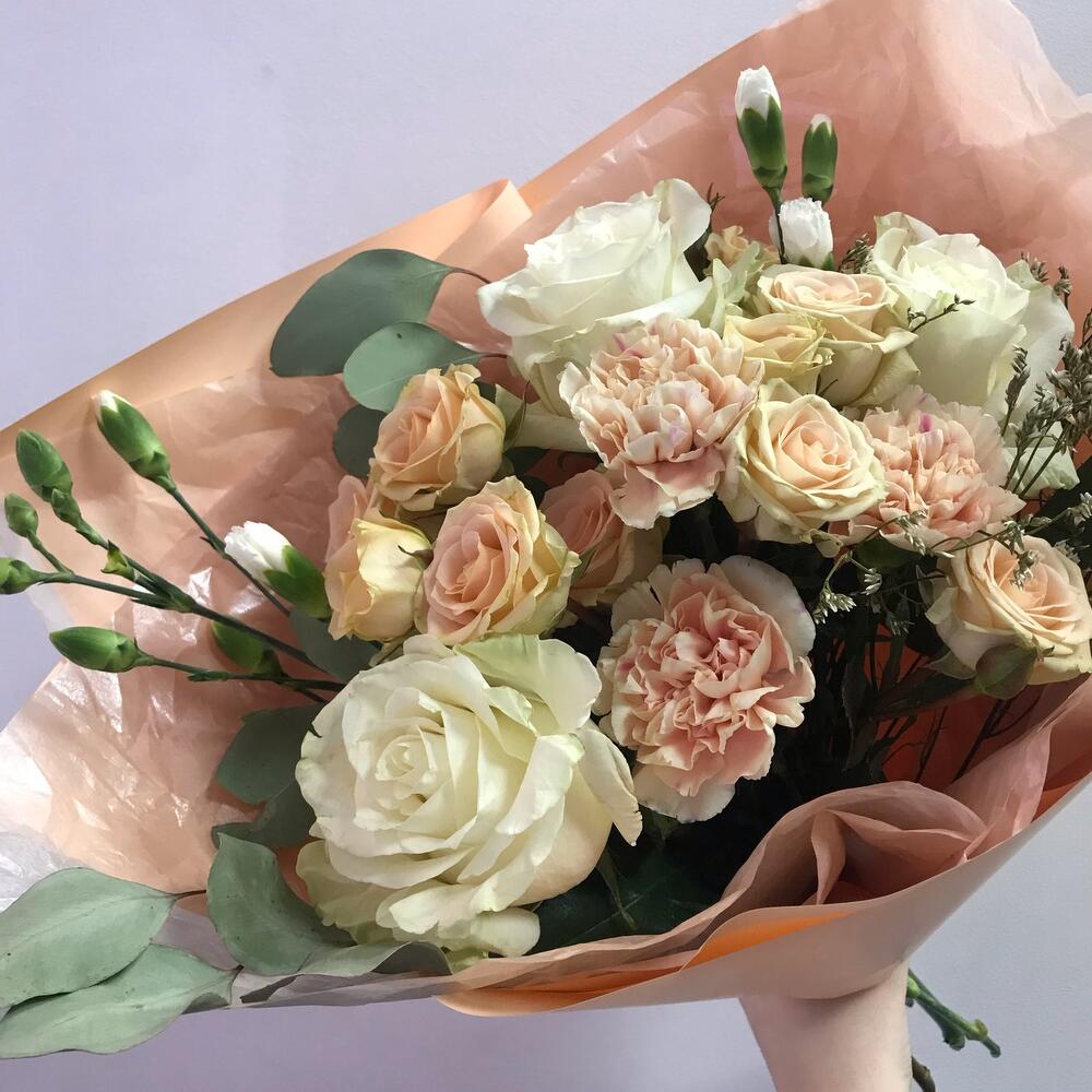 Роза – 3 шт.Роза кустовая – 2 шт.Гвоздика кустовая – 2 шт.Лимониум – 1 шт.Эвкалипт – 1 шт.Гвоздика – 3 шт.Упаковка дизайнерская – 1 шт.Открыточка с вашими пожеланиями – 1 шт.