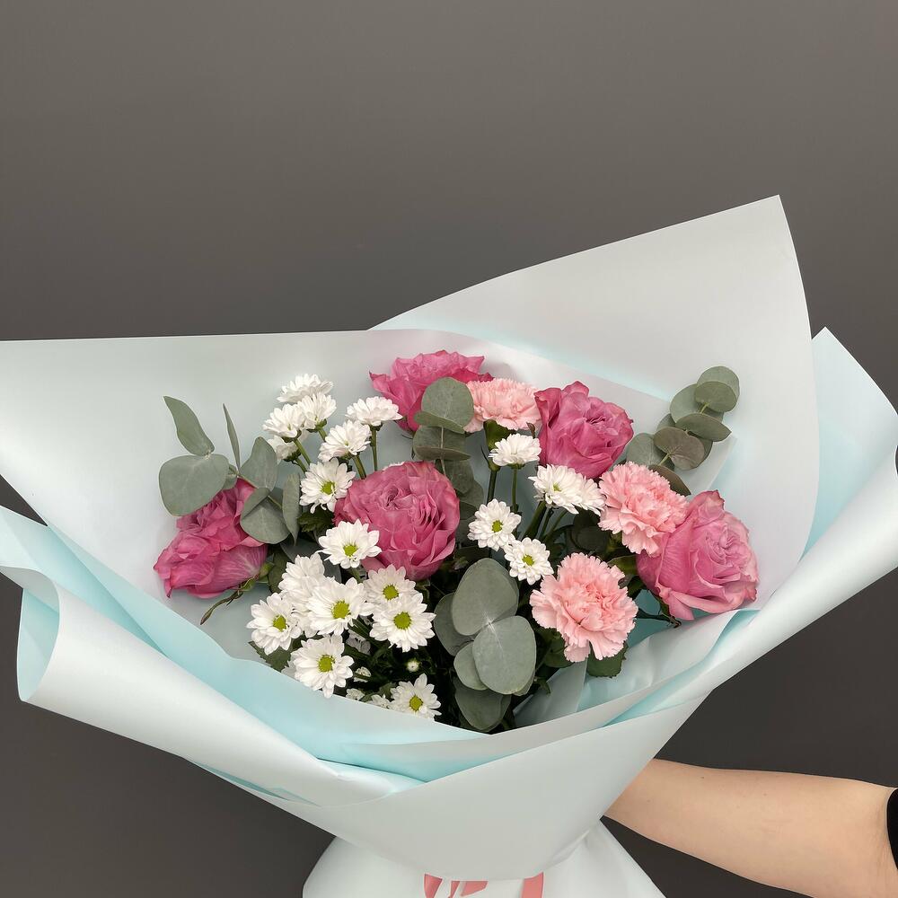 Гвоздики, Лизиантусы, Розы, Тюльпаны