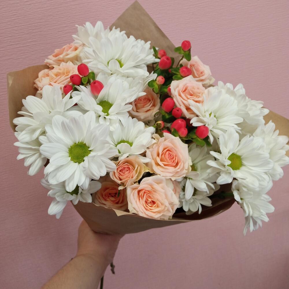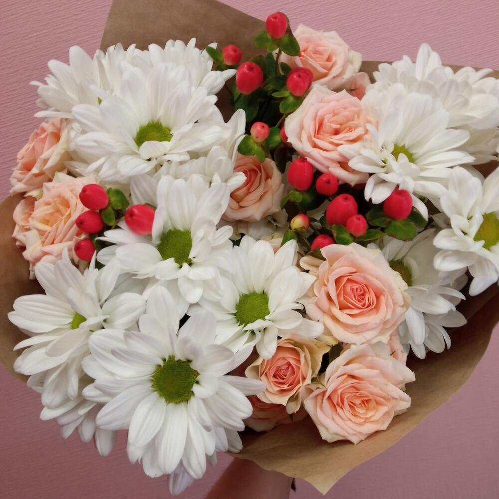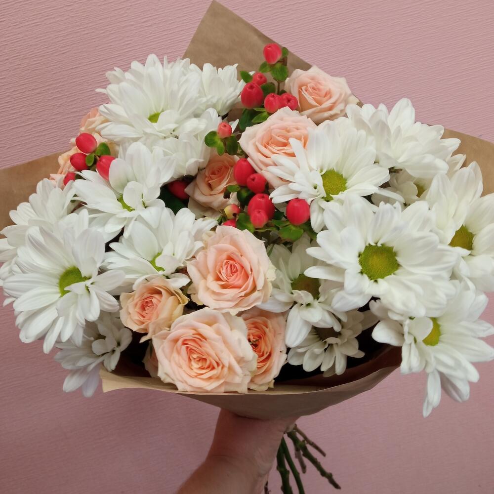 Гиперикум – 3 шт.Лента – 1 шт.Роза кустовая – 3 шт.Хризантема кустовая – 3 шт.Упаковка – 1 шт.зелень декоративная – 2 шт.