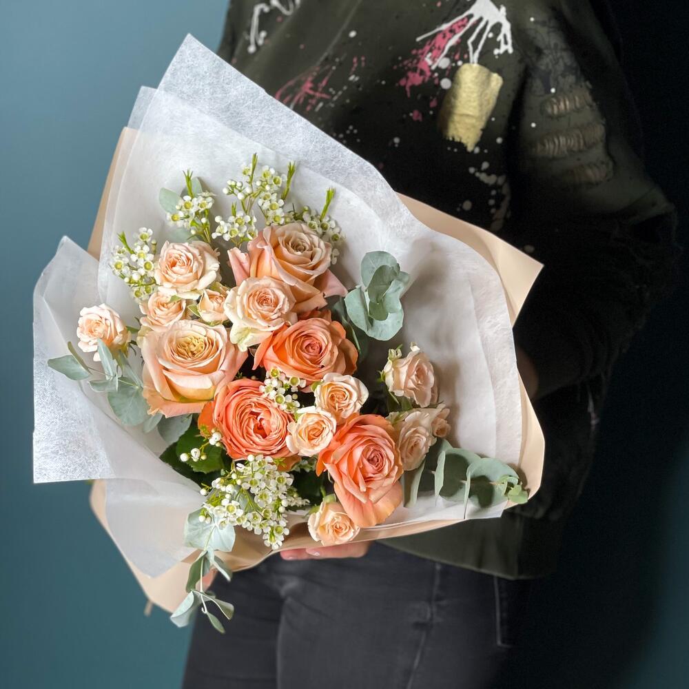 Ваксфлауэр – 2 шт.Лента – 1 шт.Роза кустовая – 2 шт.Эвкалипт – 1 шт.Роза одноголовая – 5 шт.бумага упаковочная – 2 шт.