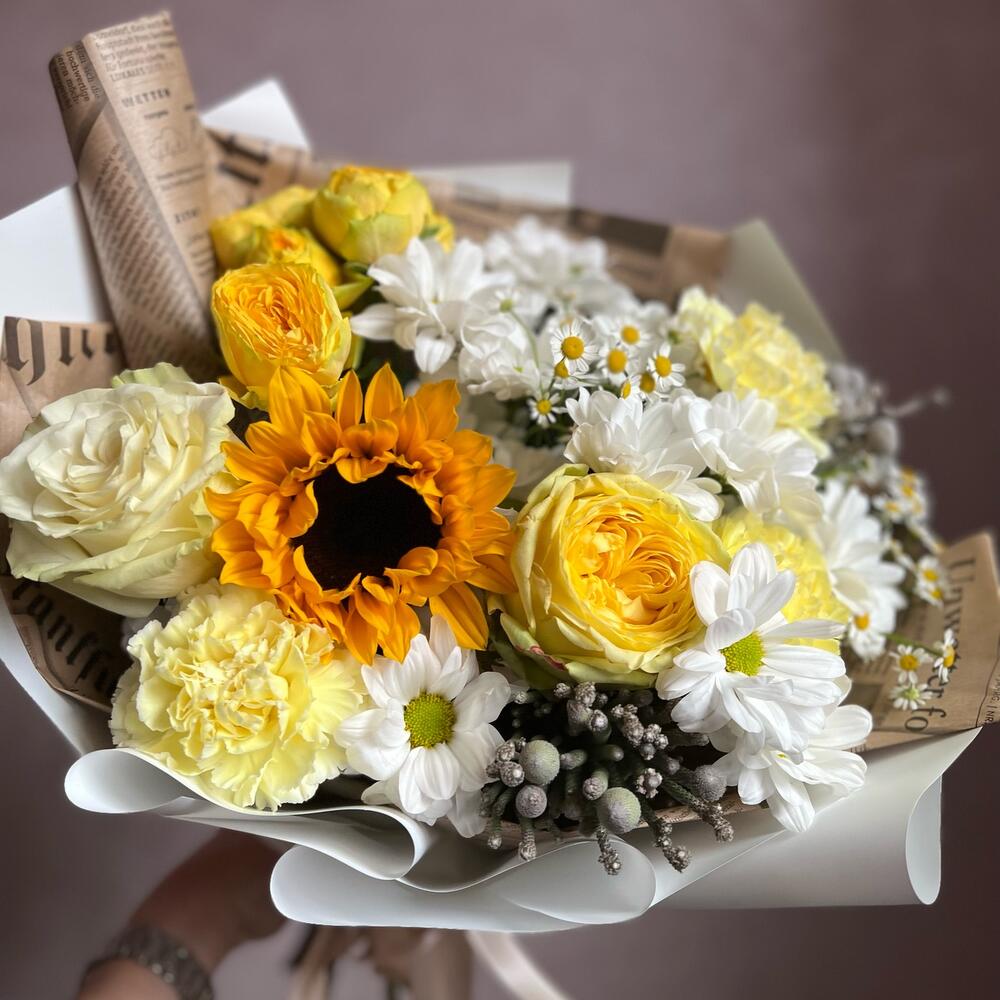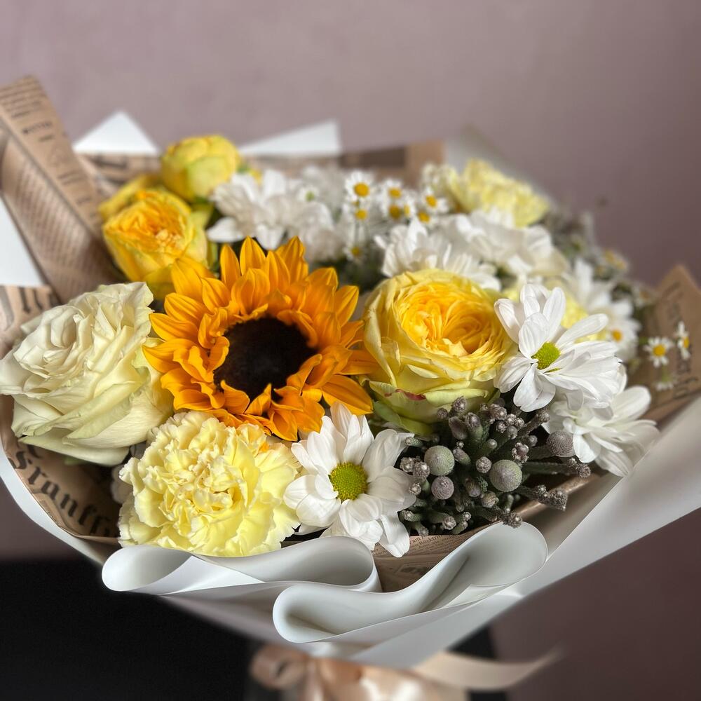Пионовидная роза – 2 шт.Бруния – 2 шт.Ромашка – 2 шт.Кустовая роза – 1 шт.Гвоздика – 3 шт.Хризантема кустовая – 2 шт.Подсолнух – 1 шт.декоративная упаковка – 1 шт.Атласная лента – 1 шт.