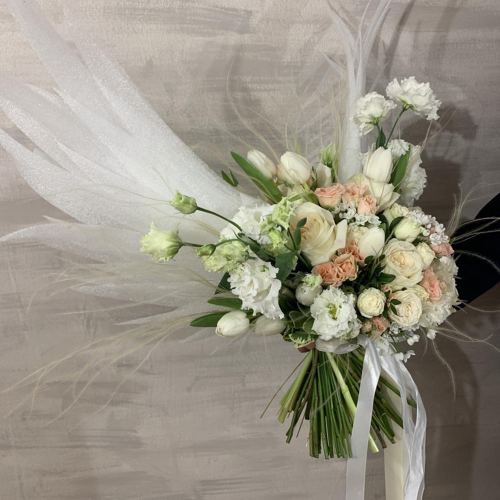 роза пионовидная «вайт о’хара» – 7 шт.роза кустовая пионовидная «miss bombastic» – 10 шт.Роза кустовая – 10 шт.эустома махровая – 10 шт.аллиум неаполитанум – 7 шт.тюльпан премиум белый – 20 шт.Ковыль – 20 шт.Питтоспорум – 5 шт.Писташ – 5 шт.декор ручной работы «крылья» – 1 шт.