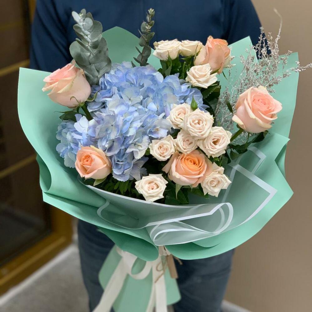 “Эвкалиптическая роскошь” гортензия и пионовидная кустовая роза