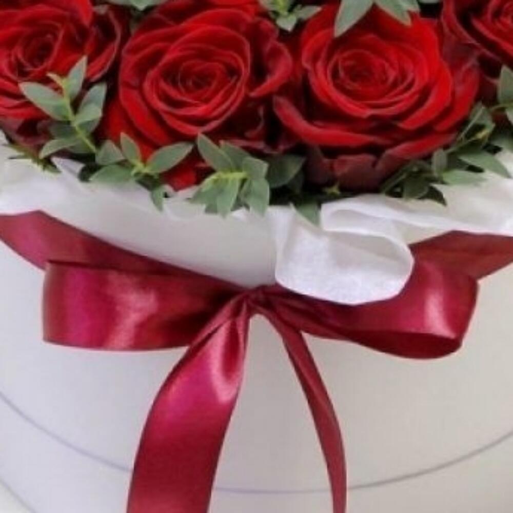 Лента – 2 шт. Эвкалипт – 4 шт. Роза – 25 шт. Коробка шляпная – 1 шт. Оазис – 2 шт.