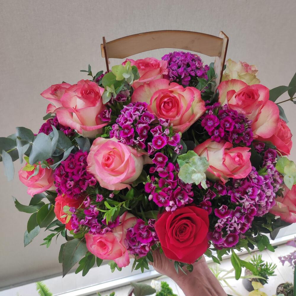 Гвоздики, Кустовые розы, Лизиантусы, Пионовидные розы, Розы