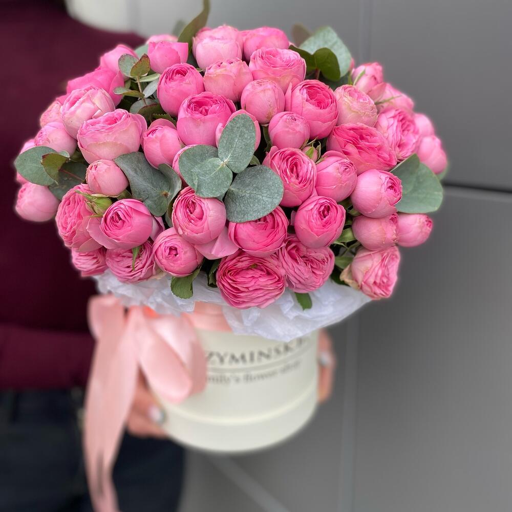 Композиция в шляпной коробке с пионовидными кустовыми розами сорта Жизель