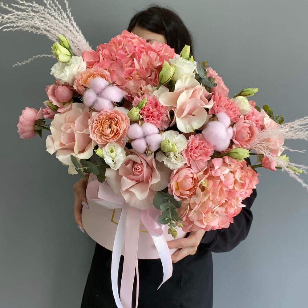 Альстромерии, Гортензии, Кустовые розы, Лизиантусы, Розы, Хризантемы
