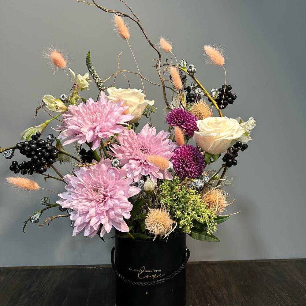 Альстромерии, Гвоздики, Кустовые розы, Лизиантусы, Розы, Хризантемы