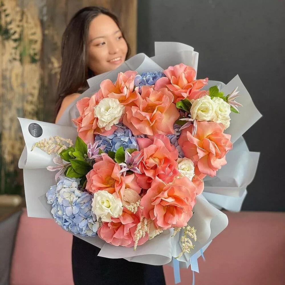 Сборный букет "EURO 3.4" состоит из 11 голландских роз, 4 голландских гортензий, 4 астильб, 5 лизиантусов и 5 веток клематиса в оформлении. Букет безмолвно может сказать обо всех Ваших чувствах, оставив лишь приятные воспоминания у получательницы. Выбрав букет от RAFALE, Вы скрасите день обладательницы букета и подарите ей незабываемые эмоции.