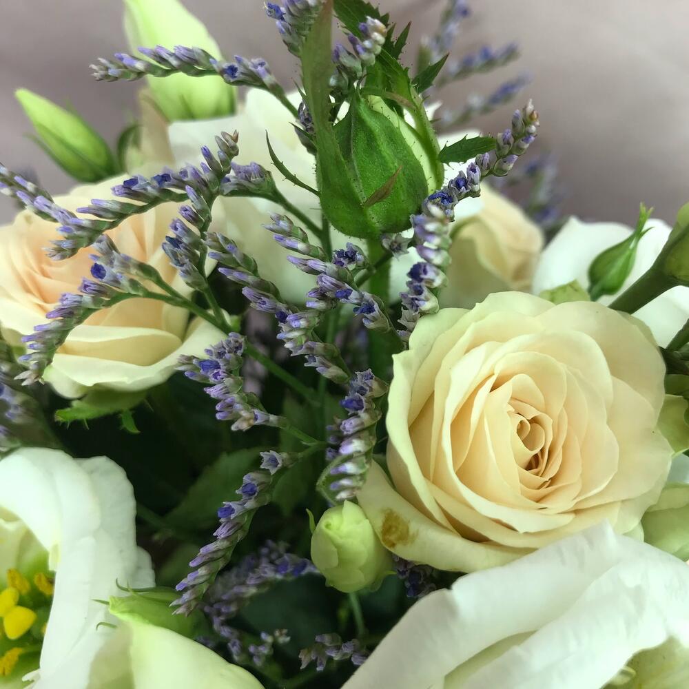 Роза кустовая – 3 шт.эустома белая – 1 шт.Лимониум – 1 шт.Кашпо – 1 шт.Бабочка декоративная – 1 шт.