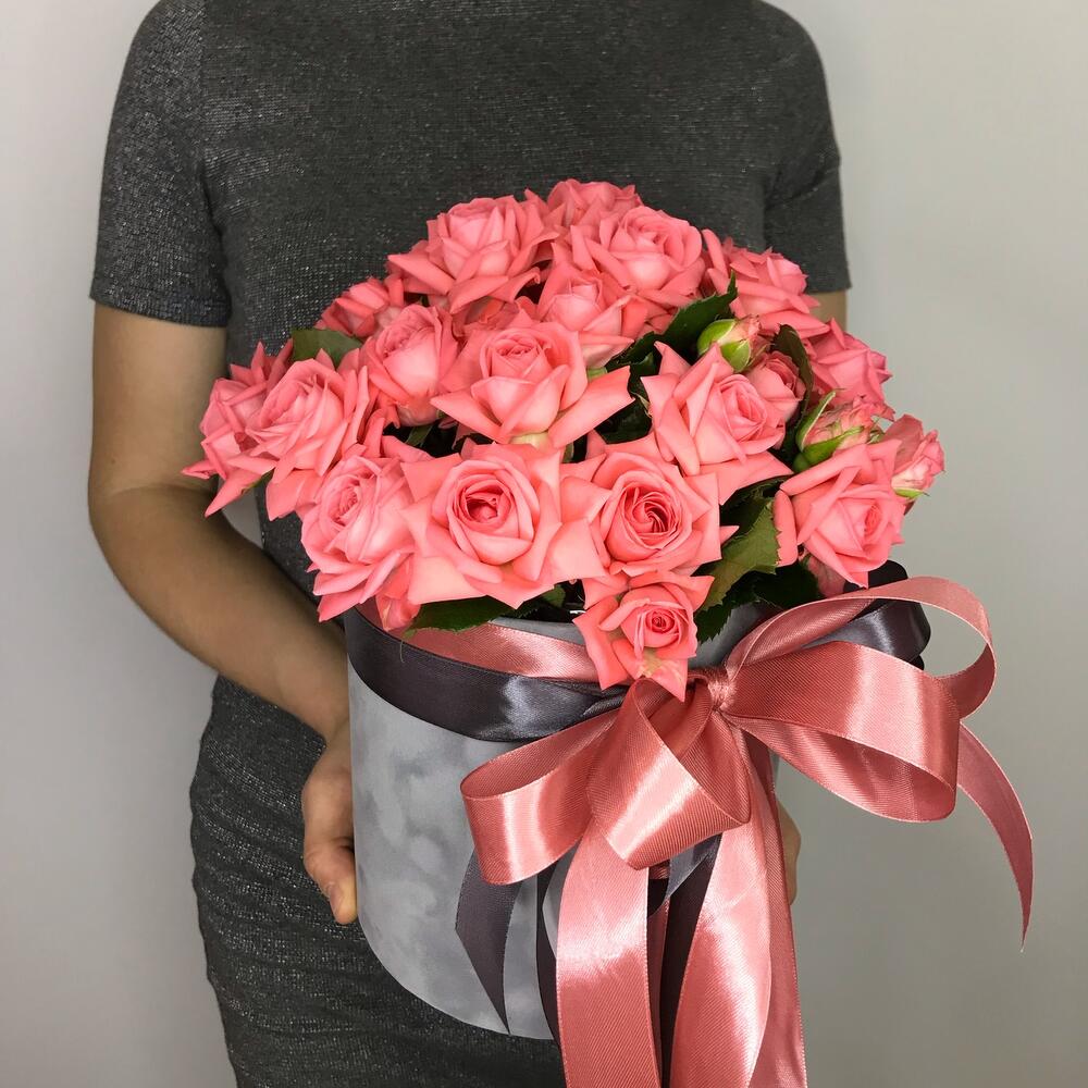 Лента атласная – 2 шт.Роза кустовая Барбадос – 11 шт.Шляпная бархатная коробка – 1 шт.биафлора – 1 шт.инструкция по уходу за цветами в флористической губке – 1 шт.