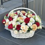 Корзина – 1 шт. Роза красная – 13 шт. Эвкалипт – 3 шт. Кустовая роза – 12 шт. Эустома – 4 шт. Оазис – 4 шт. Оформление – 1 шт. Роза сорта капучино – 9 шт.