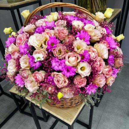 Корзина плетеная – 1 шт. Пионовидная кустовая роза – 151 шт.