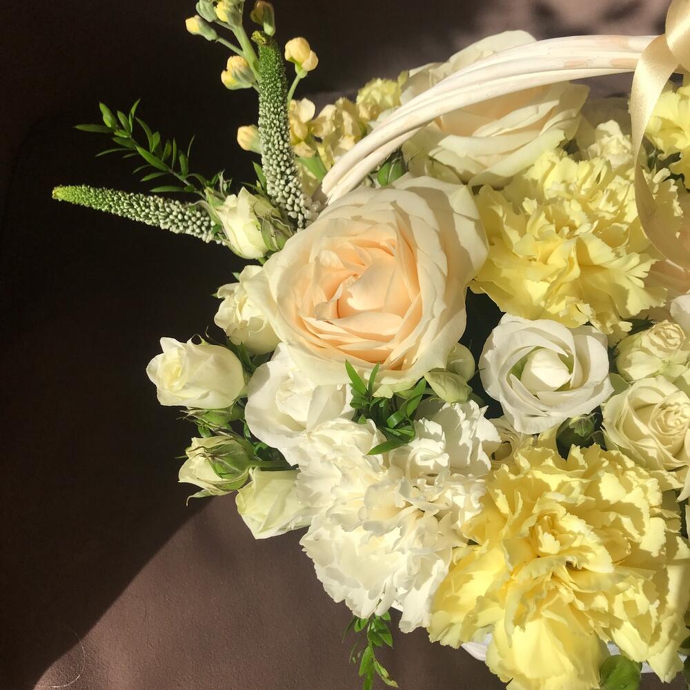 корзина 20 см – 1 шт.Губка флористическая – 1 шт.Роза кустовая – 3 шт.Лизиантус – 5 шт.Вероника – 3 шт.Маттиола – 2 шт.Аспарагус – 1 шт.Роза белая – 5 шт.Гвоздика – 7 шт.