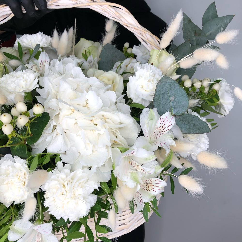 Альстромерия – 4 шт.Эвкалипт – 1 шт.Гортензия белая – 3 шт.Корзина плетеная – 1 шт.Гвоздика сортовая – 11 шт.Пистация – 5 шт.Оазис флористический – 1 шт.Роза белая аваланж – 13 шт.гиперикум кустовой белый – 5 шт.Ларгус (сухоцвет) – 5 шт.
