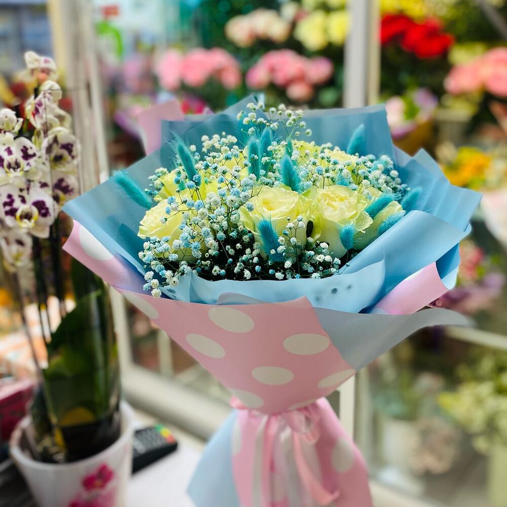 Роза Мондиаль – 9 шт.гипсофила радужная – 3 шт.Лагурус (сухоцвет) – 10 шт.упуковка – 2 шт.