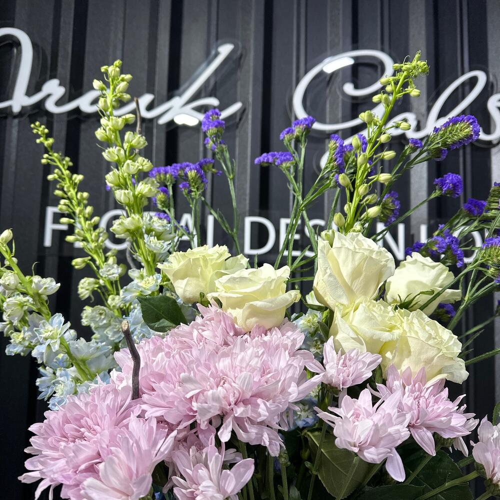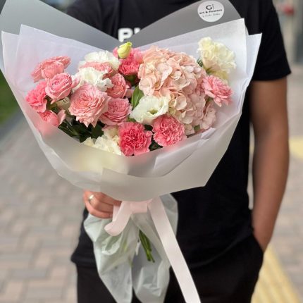 Букет, составленный из статицы, роз и дельфиниума, представляет собой мягкое и воздушное произведение искусства. Статица добавляет нотки изысканной грациозности и стойкости, розы приносят тепло и нежность, а дельфиниум создает атмосферу загадочности и нежных оттенков голубого неба. Этот букет словно путешествие через эмоциональные грани, в котором каждый цветок вносит свой уникальный вклад в гармонию и красоту композиции.