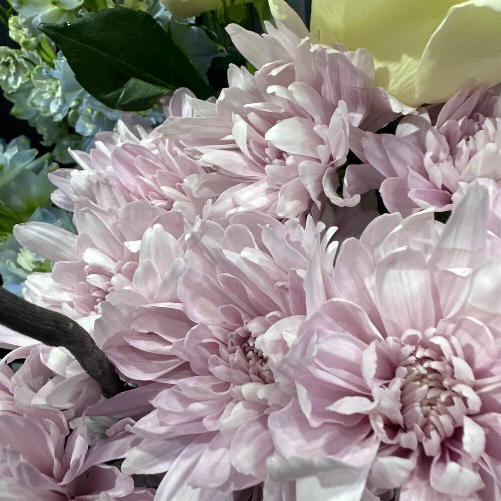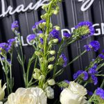 Дельфиниум – 5 шт. Статица – 3 шт. Роза мондиаль 60 см – 6 шт. Хризантема кустовая – 6 шт.