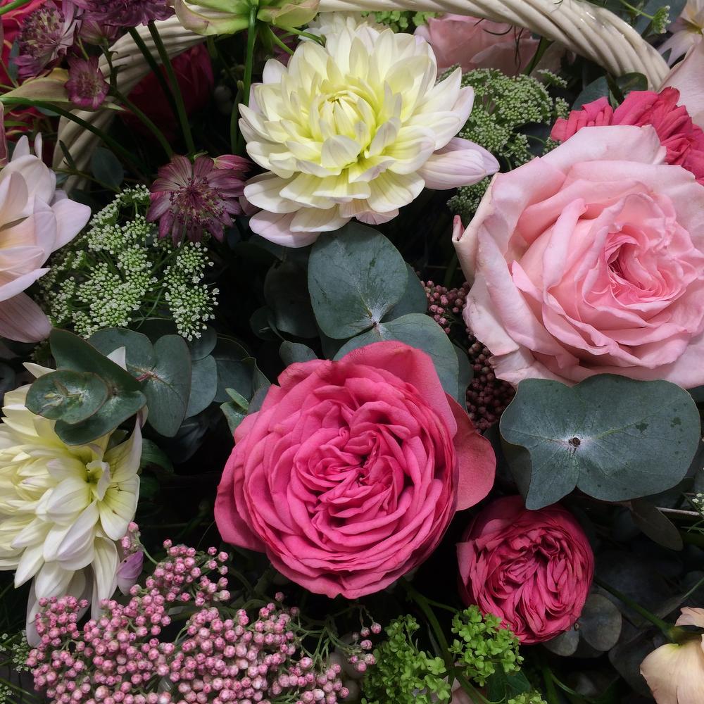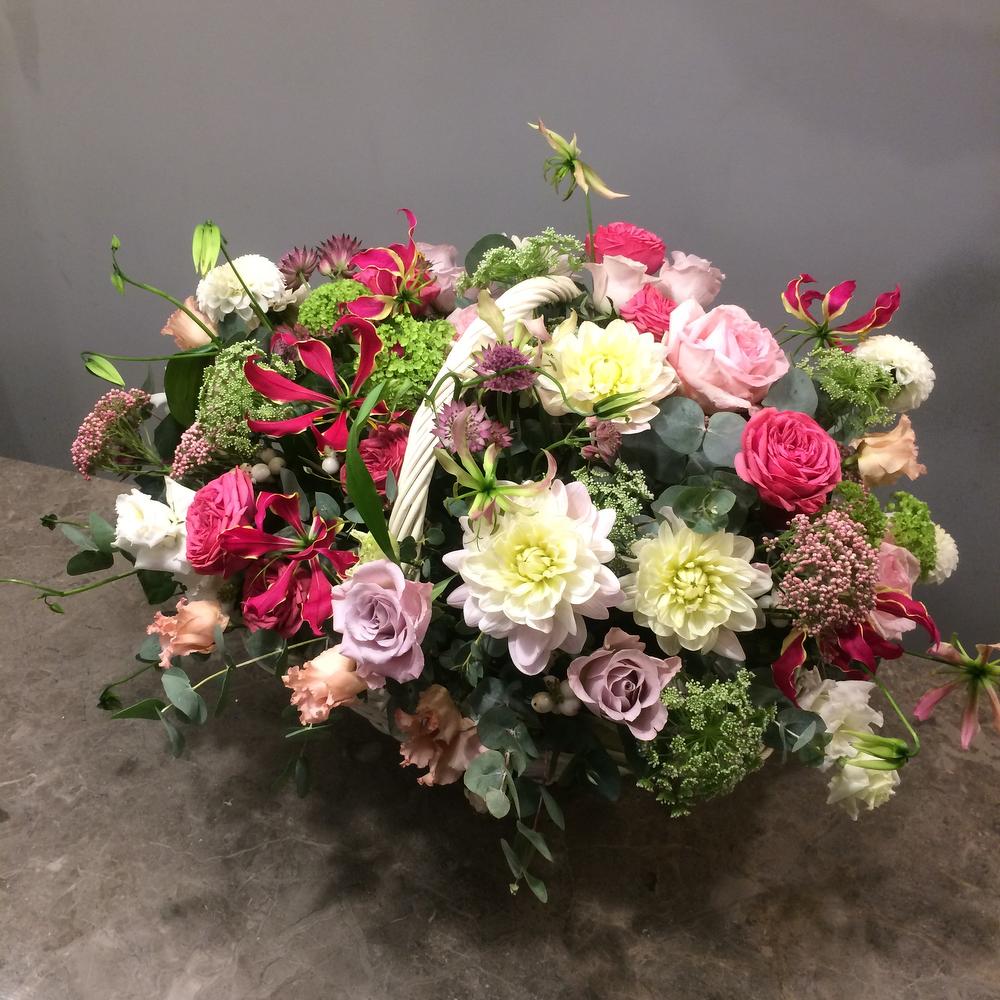 Роскошная садовая корзина с пионовидными розами, георгинами, астранцией, эвкалиптом и тропической глориозой.Стильное цветочное решение для любого случая.⠀Ширина корзины около 110 сантиметров, высота корзины около 90 сантиметров.