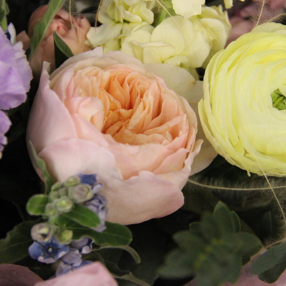 Ранункулюс – 4 шт.Маттиола – 5 шт.Твидия – 5 шт.Диантус – 5 шт.Роза пионовидная кустовая – 3 шт.Эвкалипт – 4 шт.Фисташка – 3 шт.Бумага – 2 шт.Тишью – 3 шт.Лента атласная – 2 шт.