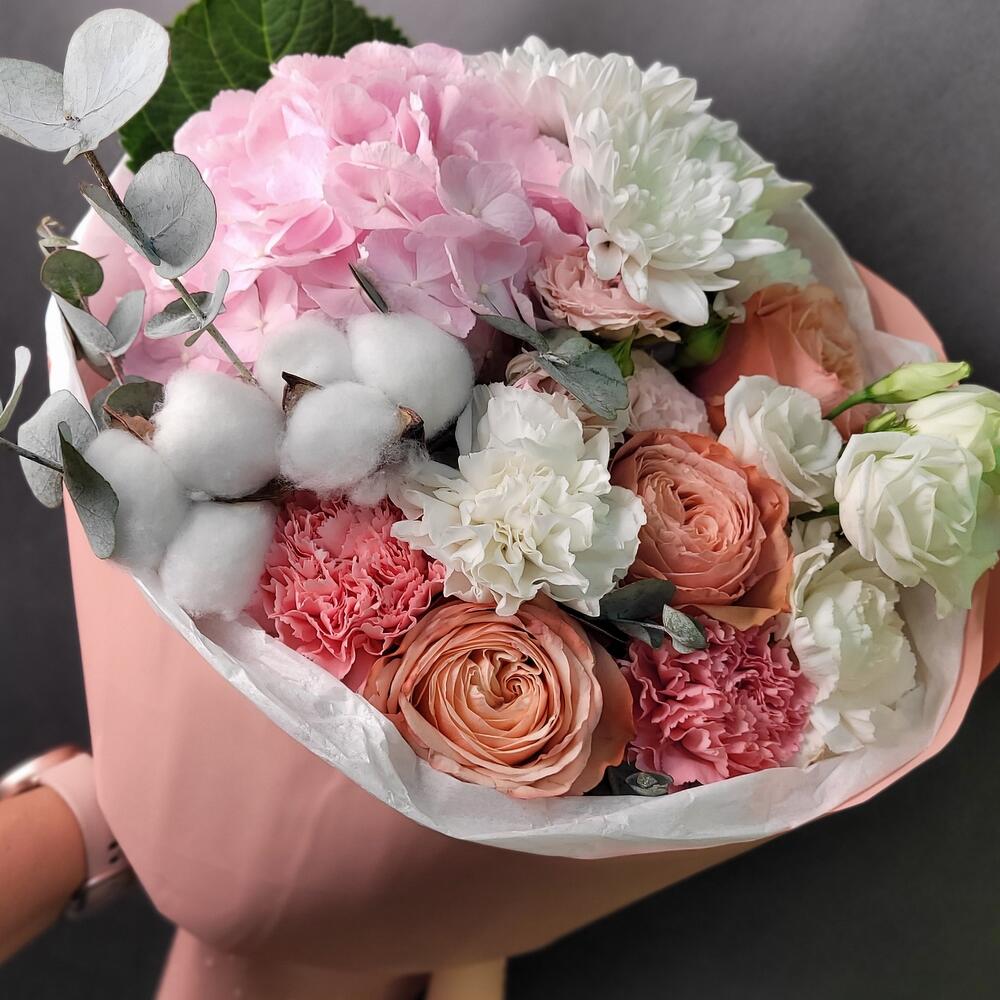 Гортензия – 1 шт.Роза кустовая – 1 шт.Хлопок – 1 шт.Хризантема кустовая – 1 шт.Эвкалипт – 1 шт.Роза Эквадор – 3 шт.Эустома – 1 шт.Лента атласная – 1 шт.Диантус – 4 шт.Упаковка дизайнерская – 1 шт.
