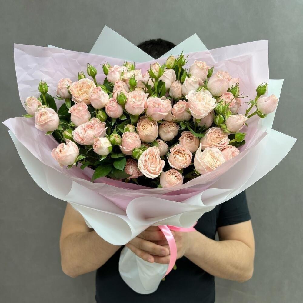 Упаковка дизайнерская – 1 шт. Открыточка с вашими пожеланиями – 1 шт. кустовые розы бомбастики – 17 шт.