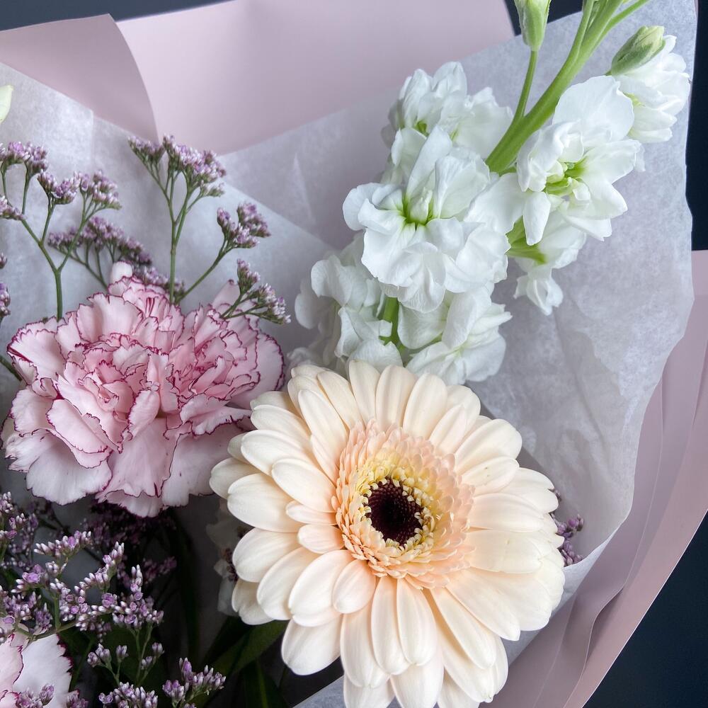 Роза белая мондиаль – 2 шт.Гербера мини – 1 шт.Гвоздика – 2 шт.Лимониум сиреневый – 1 шт.Маттиола белая – 1 шт.Лагурус (сухоцвет) – 4 шт.
