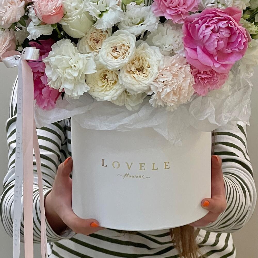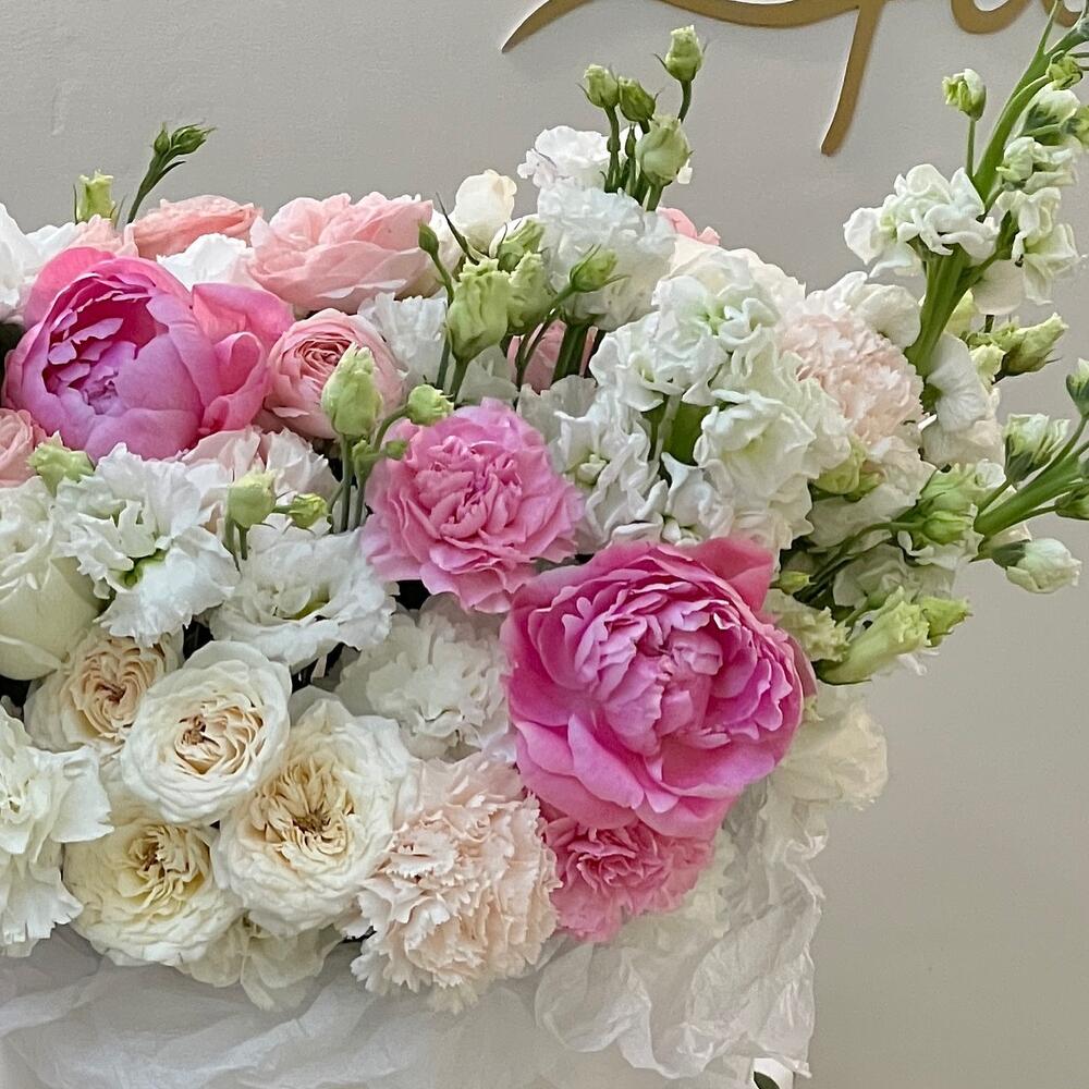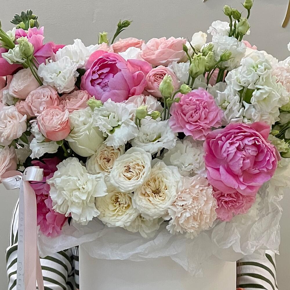 Роза кустовая белая – 2 шт.Роза кустовая пионовидная – 9 шт.Пион розовый – 5 шт.Маттиола – 5 шт.Роза белая пионовидная – 3 шт.ранцнкулюс – 2 шт.Гвоздика – 15 шт.Эустома – 7 шт.коробка большая брендированнвя – 1 шт.Лента атласная – 2 шт.Упаковка тишью – 3 шт.Оазис флористический – 1 шт.