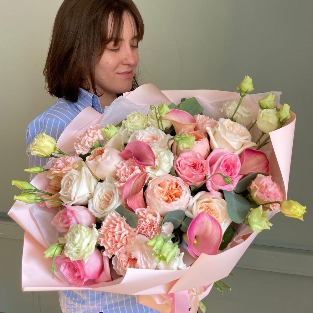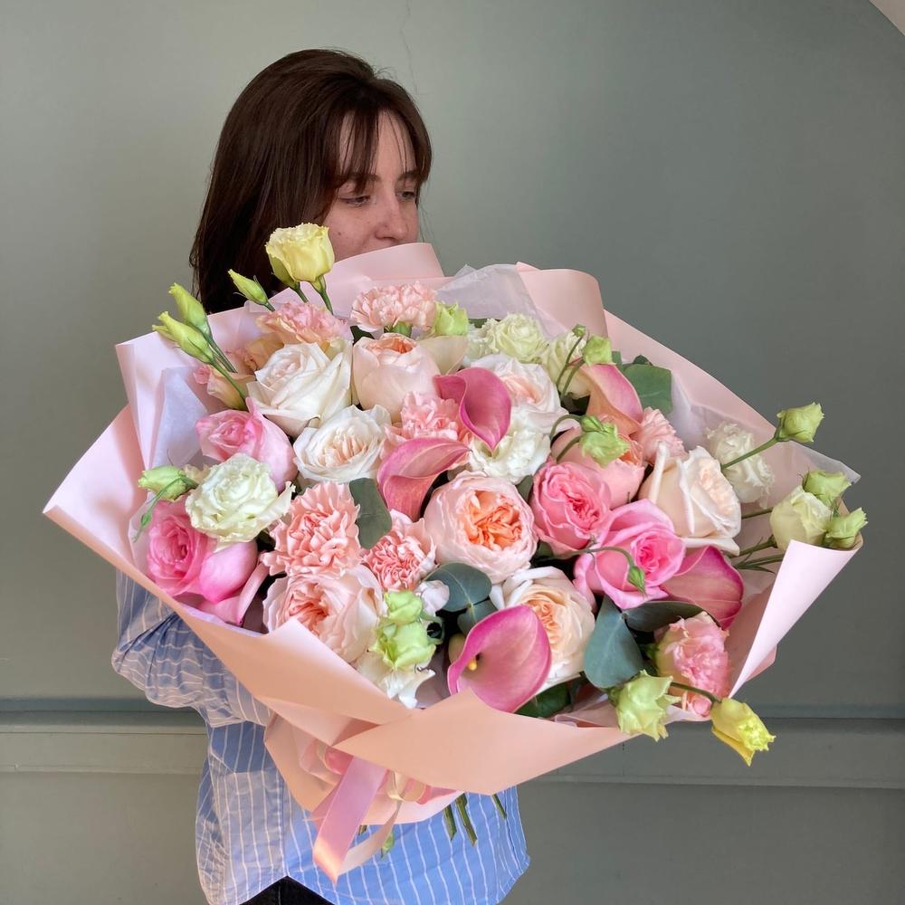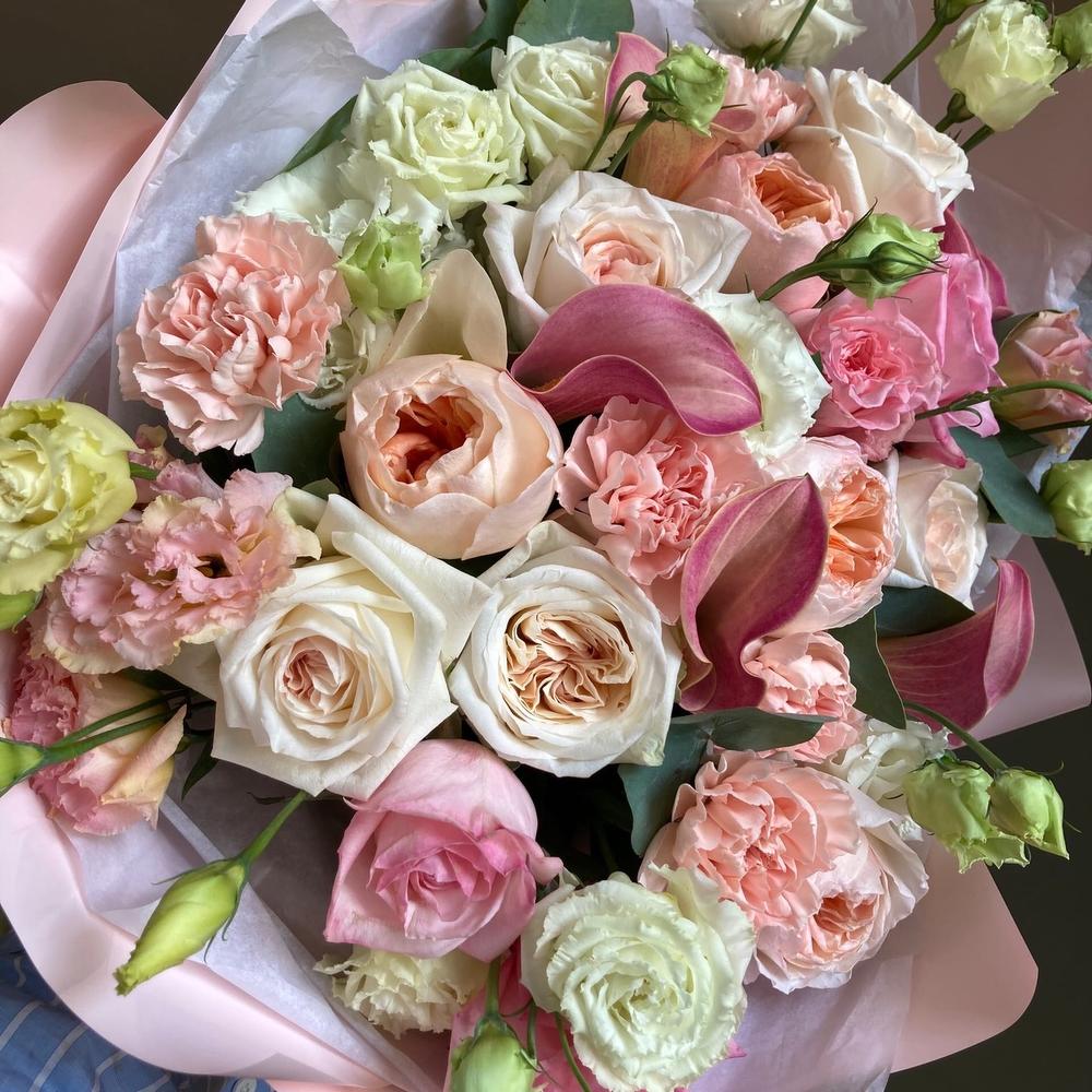 Авторский букет с пионовидными розами, каллами, лизиантусом, гвоздиками и эвкалиптом.Стильное цветочное решение для любого случая.