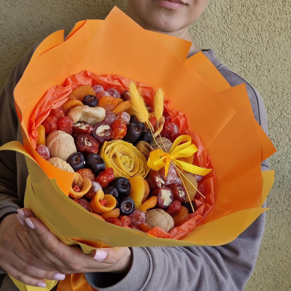 манго вяленое – 70 гр.Финики – 100 гр.кумкват в сахарной пудре – 80 гр.кизил – 80 гр.курага турецкая – 105 гр.курага бобон – 50 гр.Инжир – 50 гр.персик вяленый – 30 гр.Грецкий орех – 60 гр.чурчхела – 100 гр.Папайя – 5 гр.Лагурус (сухоцвет) – 2 шт.