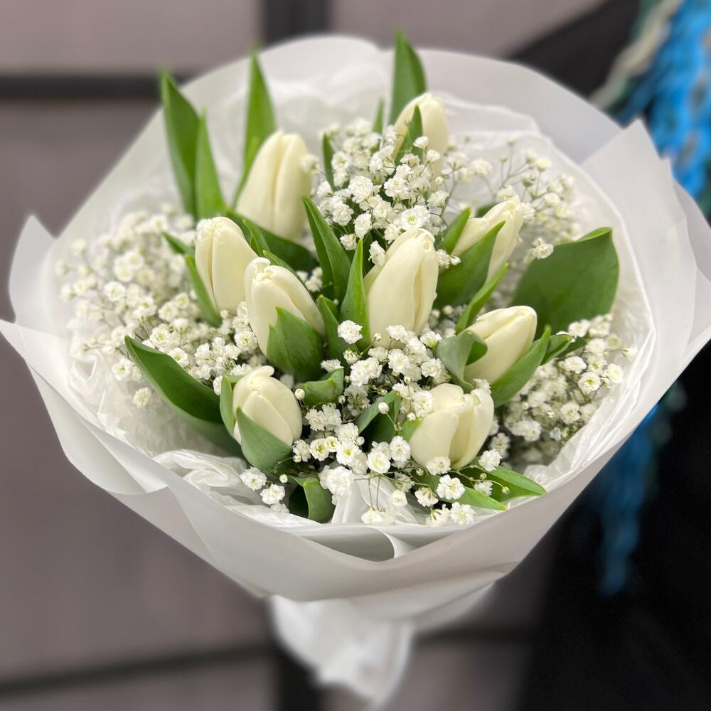 Тюльпан белый – 9 шт.Гипсофила – 2 шт.Тишью белое – 2 шт.Пленка матовая – 5 шт.Лента атласная – 2 шт.