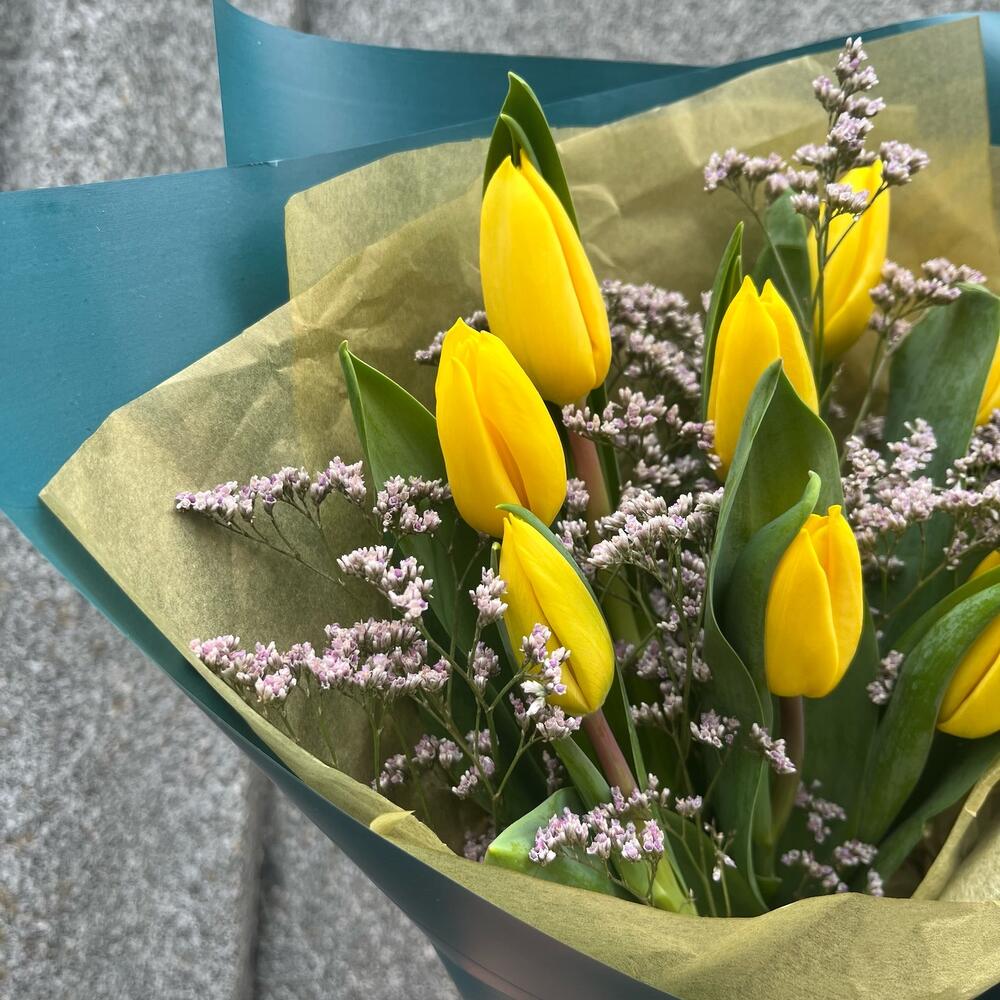 Yellow 9 тюльпанов с лимониумом